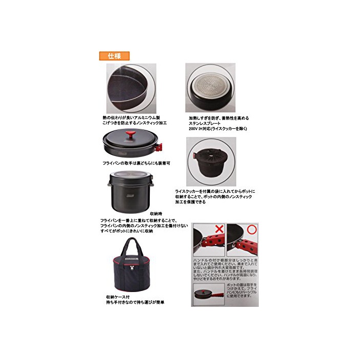 사이즈:포트/직경 약22×높이17cm,라이스 쿠커/직경 약19×높이18cm,프라이팬/직경 약22.5×높이4cm,수납 시/직경 약25×높이20cm