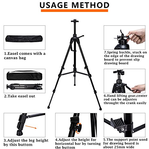 Material of Tripod Easel : Aluminum Alloy and Plastic accessory and Zinc-plated screw caps.