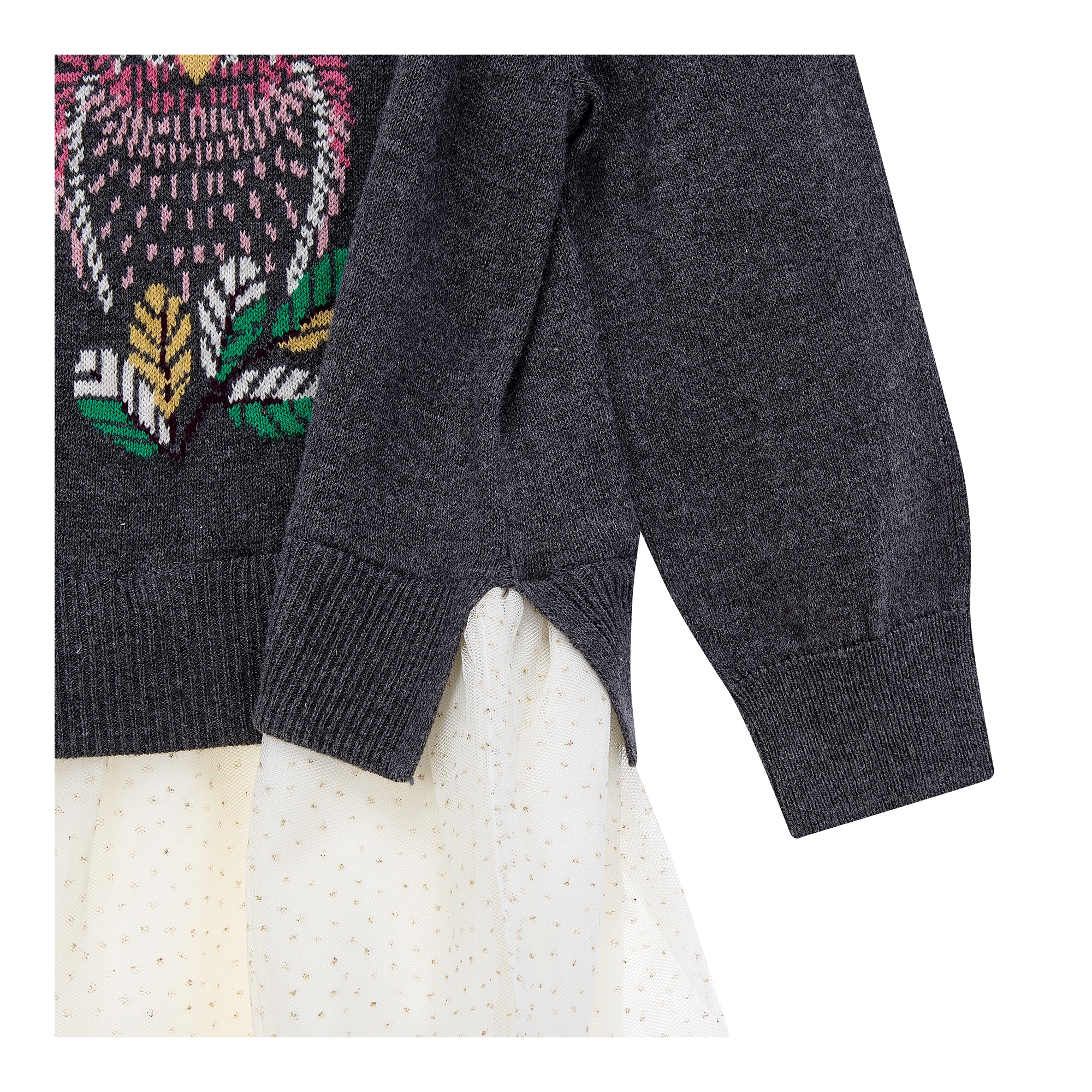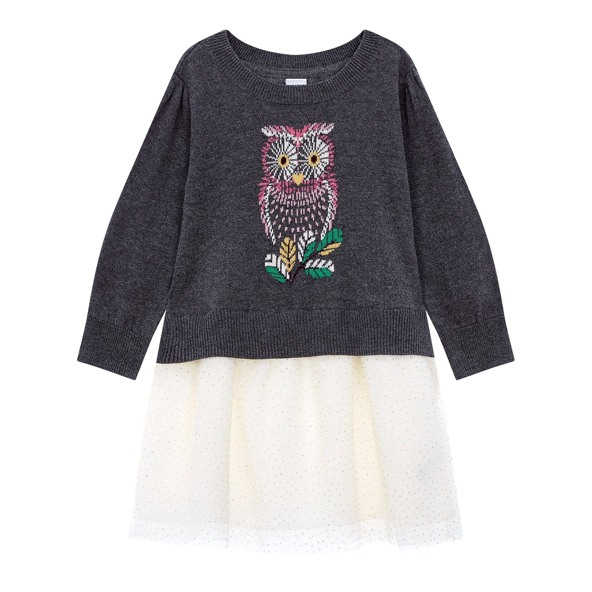 컬렉션 : 2018 Fall/Winter 디자인 포인트 : - 부엉이 인타르시아 스웨터 상의에 도트 프린트 튤스커트를 매치한 드레스 스타일링 추천 : 가디건, 데님자켓 등과 매치하여 러블리한 룩으로 스타일링