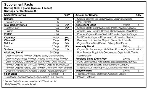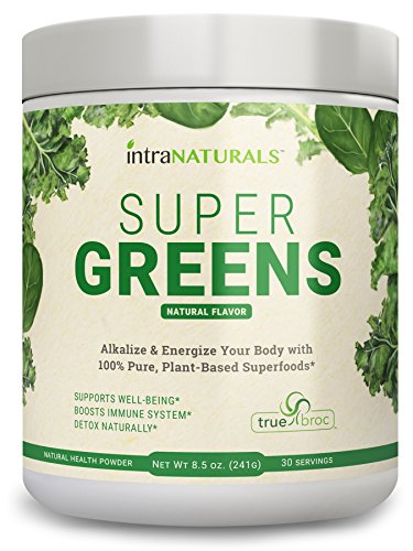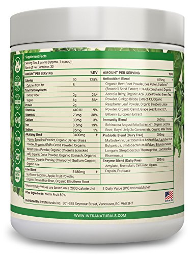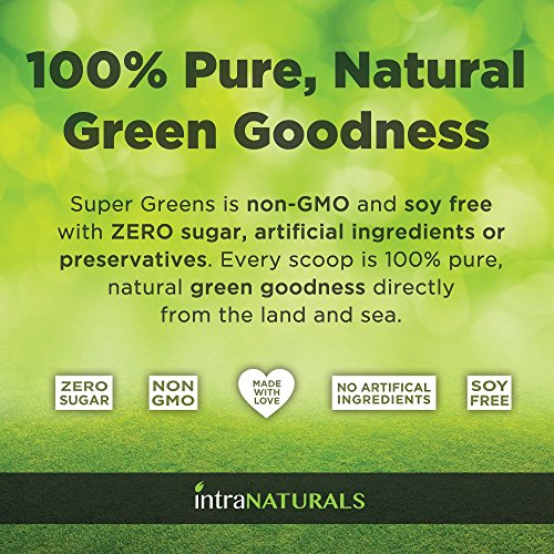 -. Feature : ORGANIC, EARTH-FRIENDLY, AND RAW DAILY NUTRITION - Super Greens is a blend of powerful raw greens, phytonutrient-rich fruits and veggies, and digestive probiotics & enzymes to give you the ultimate organic greens powder. Its made with love using pure, earth-friendly organic food sources to provide natural energy, support overall health, and to maintain a strong immune system. For best results, mix 1 scoop with 8 or more ounces of water, juice, or your favorite smoothie. / NON-GMO, SOY-FREE & ZERO SUGAR, ARTIFICIAL INGREDIENTS OR PRESERVATIVES - Super Greens is proudly made with non-GMO ingredients and is soy free with ZERO sugar, artificial ingredients or preservatives. Every alkaline-charged scoop is 100% pure & natural green goodness extracted directly from the land and sea. / CONTAINS OUR FRUIT & VEGGIE BLEND AND PROBIOTICS & ENZYMES - Super Greens contains our phytonutrient dense Organic Fruit + Vegetable Blend as well as Probiotics & Enzymes not only to help supplement vital nutrients, but to also support energy levels, digestive health, and detoxification functions. You'll experience a refreshing natural boost of energy shortly after taking Super Greens without the harsh crash that caffeine and sugar can give you a few hours later. / RICH IN FIBER, IMMUNE-BOOSTING ANTIOXIDANTS, & PHYTONUTRIENTS - We use only the most nutrient-dense greens including Organic Spirulina, Organic Wheat Grass, Organic Chlorella and Organic Alfalfa along with many other Organic superfoods which deliver a potent dose of fiber and immune-boosting antioxidants & phytonutrients - crucial to optimum health and longevity. / PROTECTED BY THE INTRANATURALS LIFETIME GUARANTEE - All IntraNaturals products come with our Lifetime Guarantee. If at any point in the future you're not happy with your order, let our friendly Customer Care Team know and we'll refund your entire purchase - 100% Guaranteed.