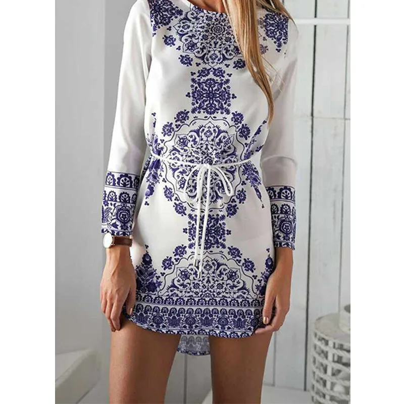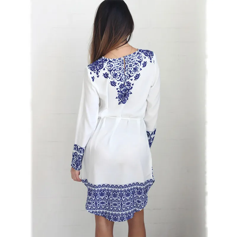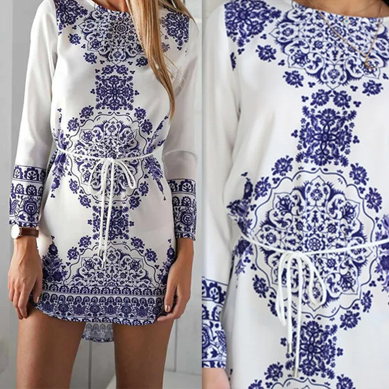Chinese National Style Blue And White Porcelain Pattern Women Elegant Dresses Cotton Long Sleeve Summer Girls Casual Dresses 1Pc