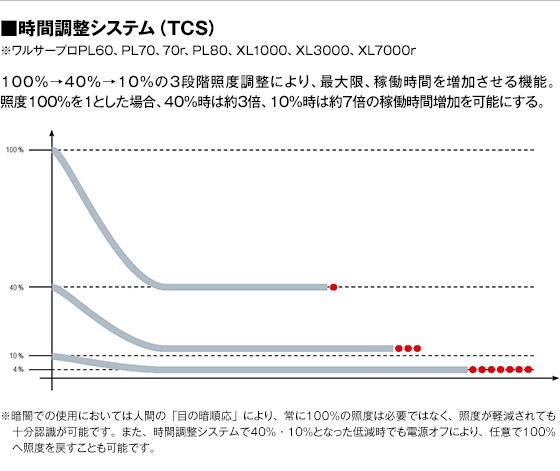 明るさ:100% 425ルーメン、40% 170ルーメン、10% 45ルーメン