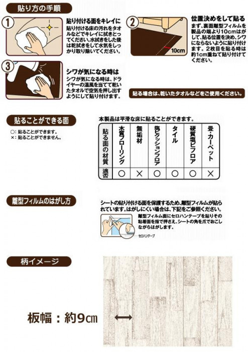 フローリングの床の上から簡単に貼れて、自分にあったイメージに変えることができるシートです。裏面の微粘着加工で、掃除機をかけてもズレません。はがす時はのり残りもなく、キレイにはがせますので賃貸の方でもご使用いただけます。寸法安定性があり、はさみで自由にカットする事ができますので、お好みの場所にピッタリと敷き詰め可能です。女性でも簡単に貼ることができますので、DIY女子にもおすすめ!! |