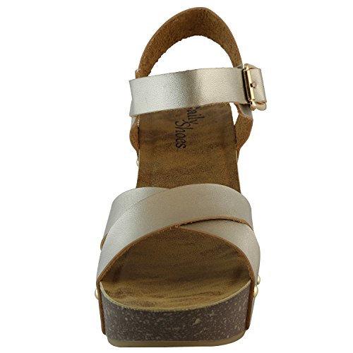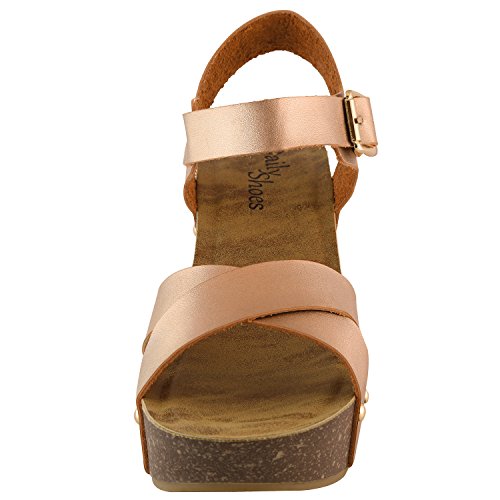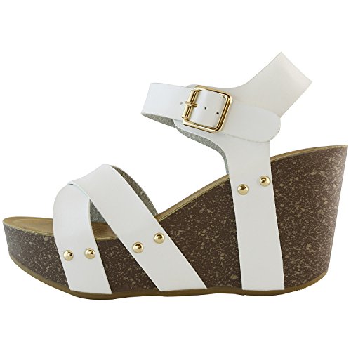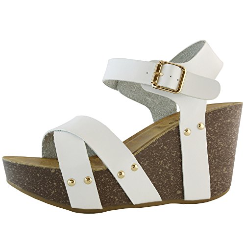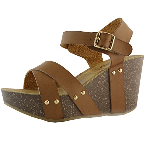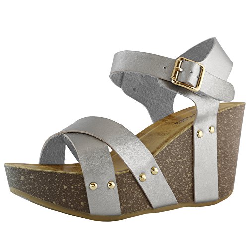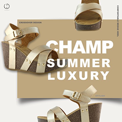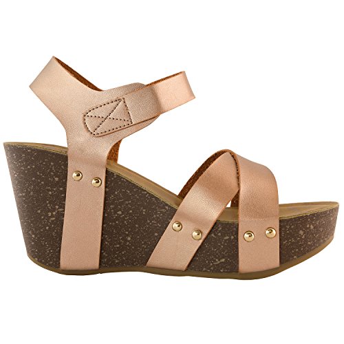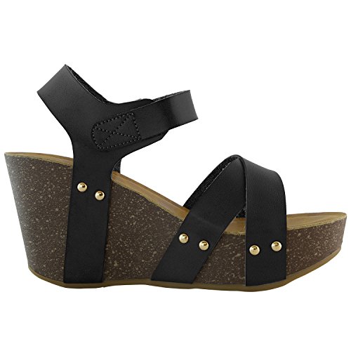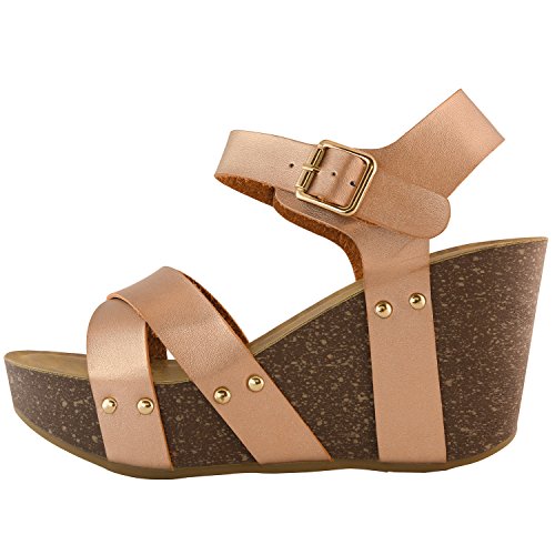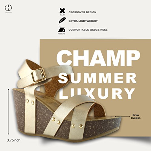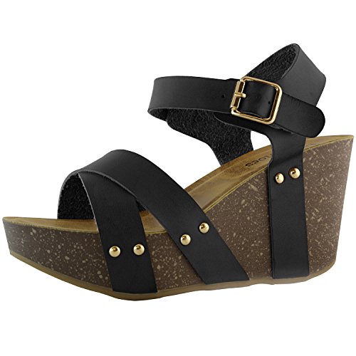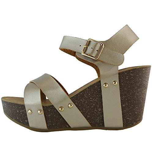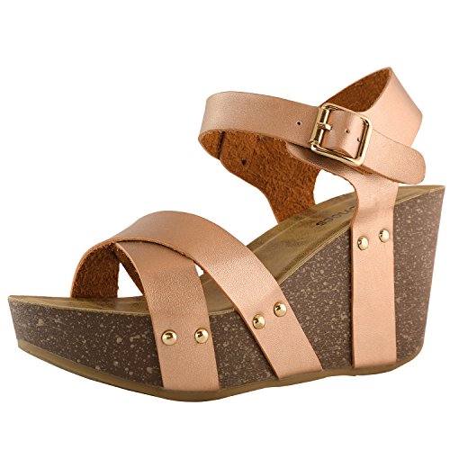 The DailyShoes Thick Cork Board Wedge Heels with Criss Cross Toe Strap are built from high quality materials that are intended to outlast years of use. They come with straps around the toe line that are thick and noticeable, crossing over one another in an x-shaped design. ON the side of the shoe, there are pairs of golden-toned studded embellishments that afford the shoe a bold and daring look. These studs match the color of the buckle for a streamlined and stylish look.
