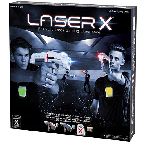 Laser X Two Player Laser Tag is like having your own Laser Tag Arena! Two (2) Laser X blasters, receiver vests and batteries are included to get the gaming started! Equipped with color lighting effects on both the blaster and vest, and a light indicator to show how many blasts are left. The Laser X offers a range up to 200 feet and will provide hours of gaming fun. Choose between team and individual play. 6 AAA batteries required (included).