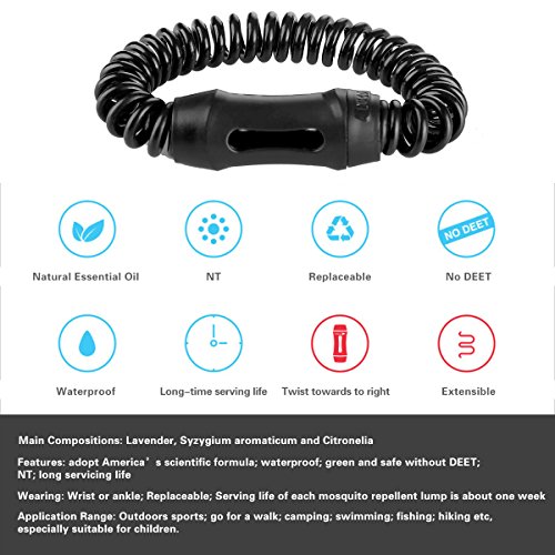 -. Feature : Adopt scientific formula and NT; Waterproof; No DEET; Long servicing life and portable / Method: suitable for wrist or ankle; replaceable mosquito repellent lump; Serving life of each mosquito repellent lump is about one week. / Application Range: Indoor and outdoors sports; climbing; camping; swimming; fishing; hiking etc