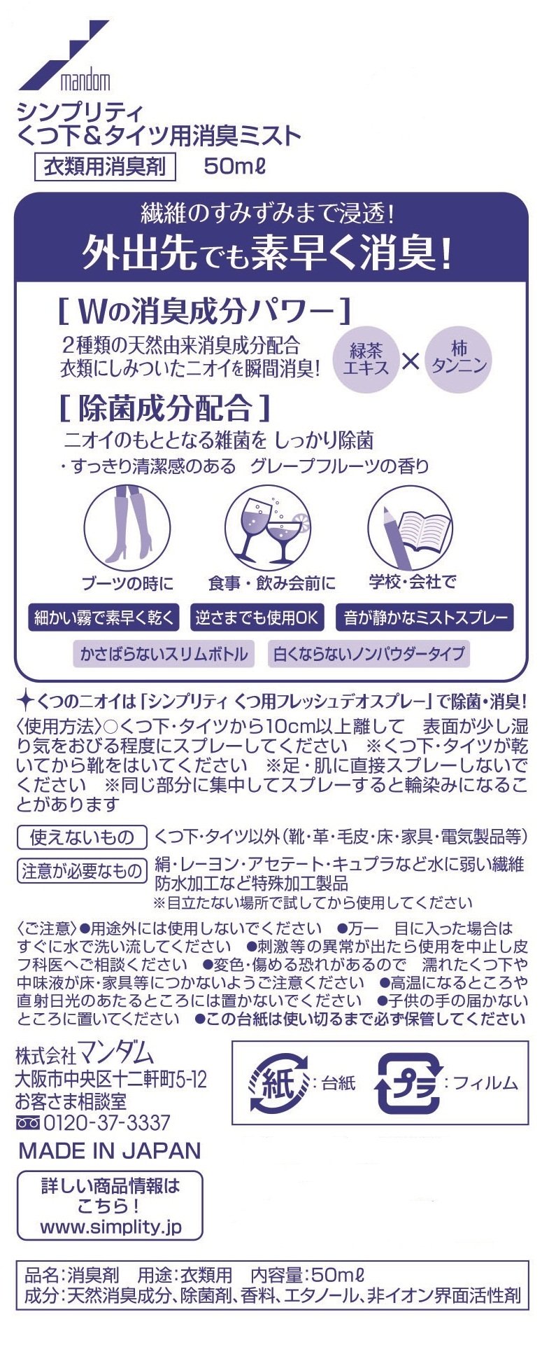 Penetrate to the corners of the fiber! Power of the deodorizing component of W! Quickly deodorize the odor of tights from tights, even on the go.