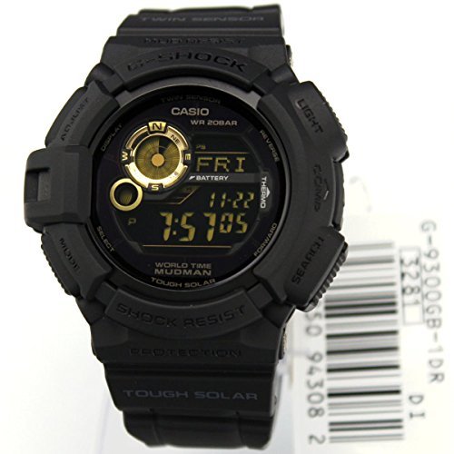 Black resin case with a black polyurethane strap. Fixed bezel. Digital black dial displaying: hours, minutes, seconds, date and day of the week. Dial Type: digital. Luminiscent el backlight. Quartz movement. Scratch resistant mineral crystal. Solid case back. Case dimensions: 53 mm x 50.8 mm. Case thickness: 18.2 mm. Tang clasp. Water resistant at 200 meters / 660 feet. Additional Info: digital compass, thermometer, moon data, countdown timer, world time: 31 time zones (48 cities + utc),. Casual watch style. Casio G Shock Mudman Solar Black Dial Mens Watch G9300GB-1.