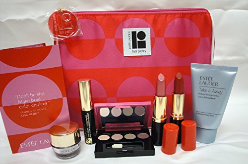 -. Feature : Set Includes: / Estee Luader Advanced Time Zone Eye Cream 0.17oz/5ml, Take It Away Makeup Remover Lotion 1oz/30ml / Pure Color Long Last Lipstick Candy (shimmer) and Scarlet Siren (Creme) Full Size .13oz/3.8g each. / Pure Color 4 Color Eye shadow Palette (10 Ivory Slipper,13 Tranquil moon, 12 Wild Truffle, 14 Provocative Plum) .01oz/.35g each / Sumptuous Bold Volume Lifting Mascara 2.8ml, Pink print Lisa Perry cosmetics bag