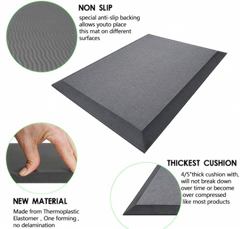 - NEW MATERIAL:Made from Thermoplastic Elastomer,eco-friendly,highest quality materials with NO toxic off-gassing smell,safe for kids and pets,advanced comfort TPE,unlike competing mats that use inexpensive re-bond polyurethane foams, this material will not break down over time or become over compressed like most products, is ergonomically superior and is designed to dramatically increase stability and reduce stress and pressure on feet, knees and the lower back over long standing periods.
