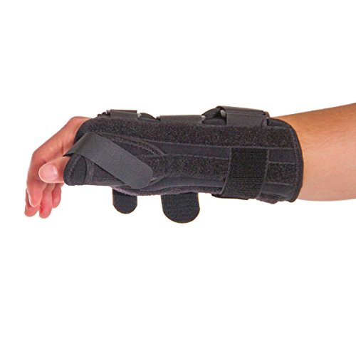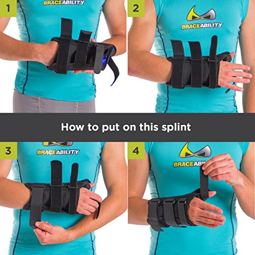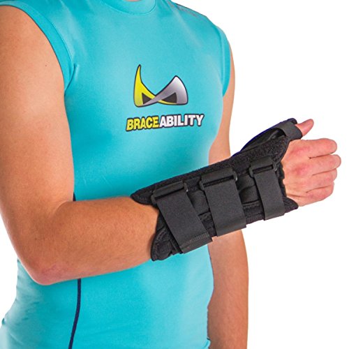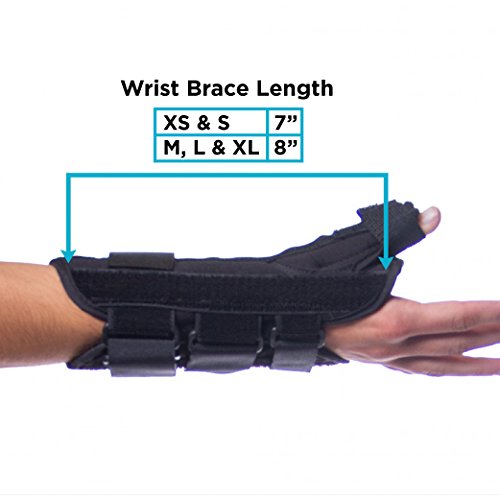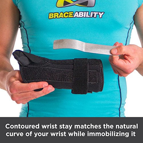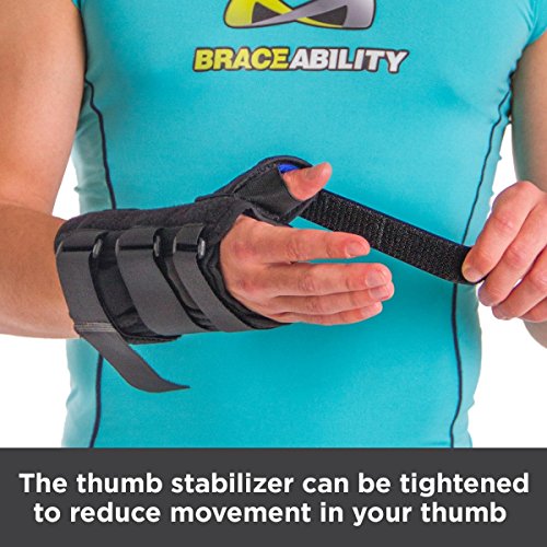 Studio : BraceAbility Publisher : BraceAbility Product Description This wrist and thumb splint immobilizes and supports the joint at the base of the thumb as well as the saddle joint between the thumb and the index finger. Wearing this brace will help to treat many lower thumb and wrist injuries including: wrist or thumb tendonitis, De Quervain's disease, arthritis, thumb or wrist sprains or strains, and rhizarthrosis. This splint is made of a durable material that will stand up to frequent use. The lycra material is also breathable and padded, which makes it more comfortable to wear. Because the color of this wrist stabilizer is black it wonOt show wear, dirt, stains, etc. Another feature that enhances the comfort of this brace is the contouring that is incorporated in several areas of the brace. The contouring in the palm area of the brace allows you to move the fingers normally, including movements such as grasping or clenching. There is also contouring at the pinky joint, allowing one to spread the fingers. This wrist brace has aluminum stays for extra support that can be removed for a more flexible brace. You can also mold the thumb stay as needed for a customized fit. There are three Velcro closures along the wrist and forearm area, to ensure the brace stays in place. The closures of this wrist support make it easy to apply and adjust the compression. If the strap ends are too long, you can cut off the excess material. This wrist and thumb brace extends up the arm for added support to the wrist and forearm. Sizes XS and S are 7" long and sizes M-XL are 8" long. This measurement does not include the thumb portion, see image above for details. You can choose between a right or left brace, along with five different sizes. To determine what size you will need, measure the circumference around your wrist, above your wrist bone. Washing instructions: Remove the metal stays prior to washing. Wash the brace in cold water, on a gentle cycle with a mild soap. Air dry, do not expose the brace to any heat source. 0