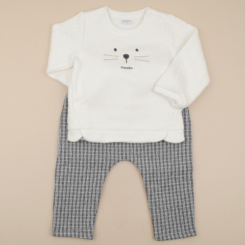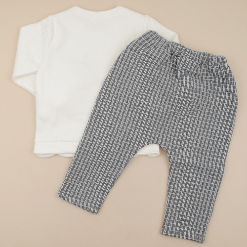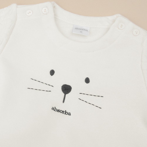 -귀여운 캐릭터자수포인트의 티셔츠와 바지의 상하세트 아이템입니다.-티셔츠는 따뜻하고 신축성이 좋은 밍크기모지와 소매에 케이블조직이 배색되어 있어 멋스럽게 입을 수 있습니다.