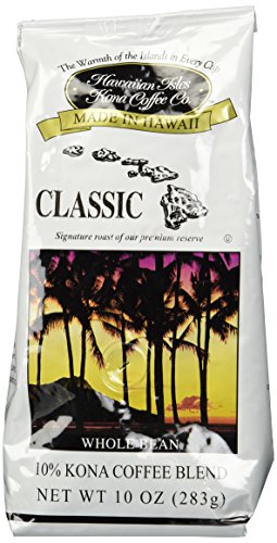 -. Binding : Misc. -. Brand : Hawaiian Isles Kona Coffee -. EAN : 0091903101116 -. Feature : 10% Kona Coffee with the finest arabica beans from around the world! / Roasted and packaged in Honolulu, Hawaii / 2 tablespoons with 6 oz. of water for each cup / Store in a cool dark place -. IsAdultProduct : 0 -. Label : Hawaiian Isles Kona Coffee Co. -. Manufacturer : Hawaiian Isles Kona Coffee Co. -. NumberOfItems : 1 -. PackageQuantity : 1 -. ProductGroup : Grocery -. ProductTypeName : GROCERY -. Publisher : Hawaiian Isles Kona Coffee Co. -. Size : 10 oz. -. Studio : Hawaiian Isles Kona Coffee Co. -. Title : Hawaiian Isles Kona Classic Whole Bean Coffee -. UPC : 091903101116