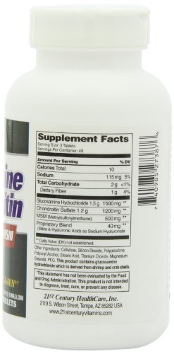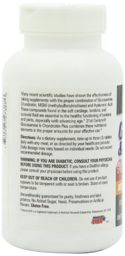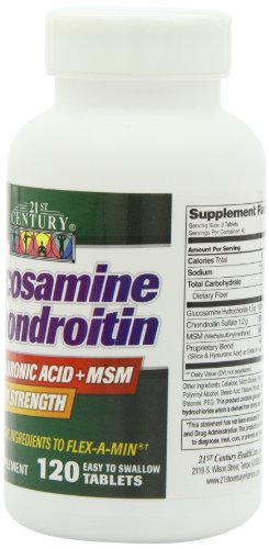 Studio : 21st Century Publisher : 21st Century Binding : Health and Beauty Product Description Many recent scientific studies have shown the effectiveness of taking supplements with the proper combination of Glucosamine, Chondroitin, MSM (methylsulfonylmethane) and Hyaluronic Acid. These compounds found in the soft cartilage, tendons and synovial fluid are essential to the healthy functioning of tendons and joints, especially with advancing age. 21st Century Glucosamine and Chondroitin Plus combines these nutritional elements in the proper amounts for your effective use. Unconditionally guaranteed for purity, freshness and label potency. No added Sugar, Yeast, Preservatives or Artificial Flavors. 21st Century Vitamins and Supplements are manufactured in a cGMP facility under the strictest standards for product quality, including potency and purity. 21st Century prides itself on providing you with a great product at the best value. This statement has not been evaluated by the Food and Drug Administration. This product is not intended to diagnose, treat, cure, or prevent any disease. Flex-a-min is a registered trademark of Arthritis Research Corporation, Ronkonkoma, NY 11779 0