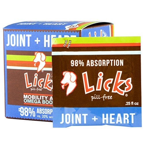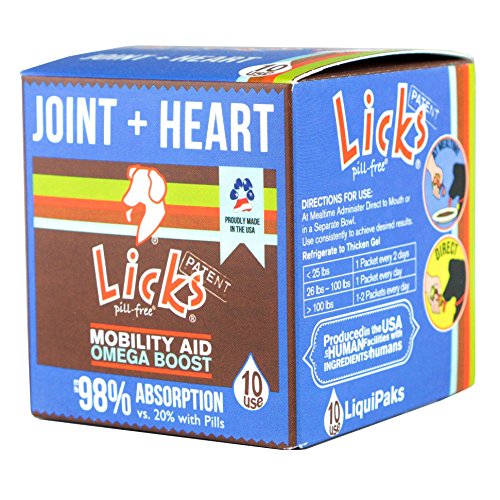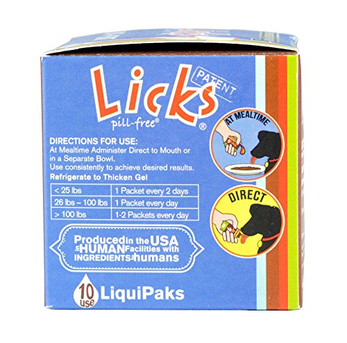 -. Feature : Anti-inflammatory aid that also promotes blood circulation and healthy heart function for all dogs / Aids in mobility and eases discomfort and joint stiffness due to normal daily exercise. Fast-Acting and easy to use - highly palatable with high doses of active ingredients / Pill-Free administration process allows for 98% absorption rate vs. 20% with pills and chews. In other words, LICKS is up to 10x's more effective than pills or chews! / Sourced and produced in the US, with Roasted Chicken Taste! Made with 100% real, all-natural chicken in facilities with ingredients for products meant for human consumption - 100% Human Grade. / Patented Ingredient formulation: Administer direct to mouth of dog or in a separate bowl; use consistently to achieve desired results.
