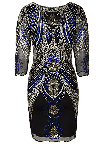 Vijiv 1920s Flapper Dress With 3/4 Sleeve V Neck Squins Cocktail Gatsby Dresses, Black Blue, Small