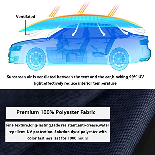 - 【Multifuction Car Protection】 Open size: W86.62*L157.48in (W2100*L4000mm),sunscreen air is ventilated between the tent and the car,blocking 99% UV light,reduce interior temperature.The big surface also can protect car from dust, acid rain, bird dropping, deciduous leaves etc.Windproof ropes is adjustable,you can adjust the length of windproof rope to suit different cars.You also can plus triangular bracket, suitable for outdoor barbecue, picnic, fishing and so on