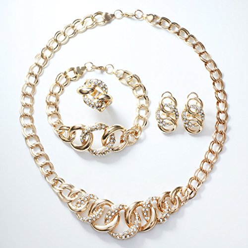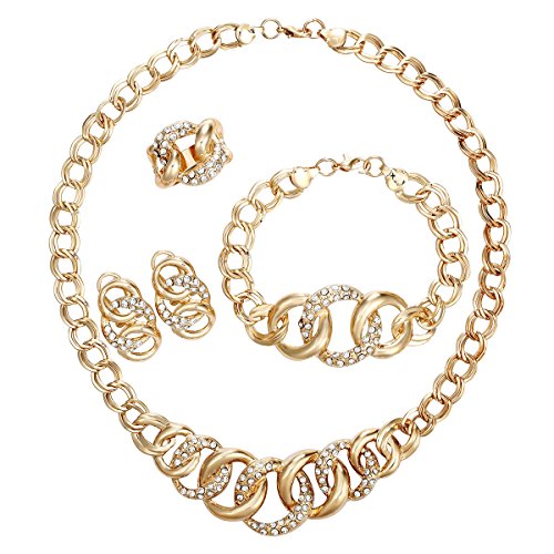 -. Feature : Indian Circled Statement Crystal Gold Plated Jewelry Set of Necklace Earrings Bracelet Ring / Shinning, beautiful, luxury looking jewelry set for Celebration, Wedding, party, holiday and Show / Size: As Picture Marked / Nickel & Lead Free, Gold plated, harmless and hypoallergenic for skin / Ideal gift for your girlfriend, fiancée, wife, mother or friend. A good choice for engagement or wedding jewelry too.