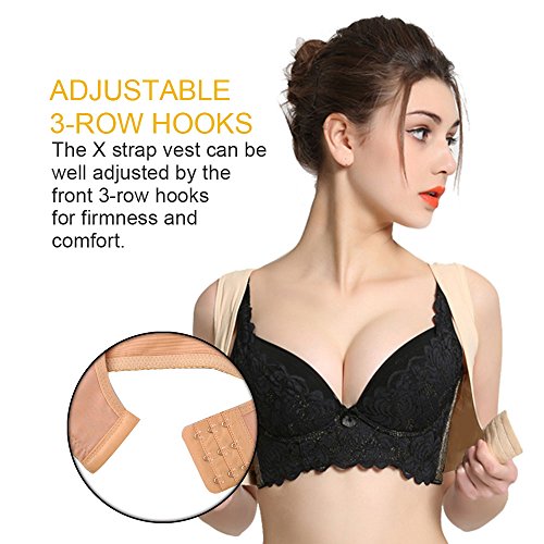 - ELIMINATE BACK PAIN & ADJUSTABLE 3-ROW HOOKS -- Most back pain is caused by poor posture. The Woman Posture Corrector improves for a better posture. The X strap vest can be well adjusted by the front 3-row hooks for firmness and comfort.
