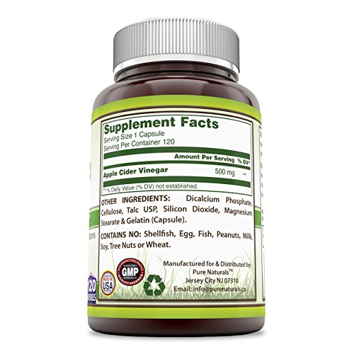 500 mg Apple Cider Vinegar per capsule -- 120 Capsules per bottle Easy-to-swallow capsules -- Great for those who dislike Apple cider vinegar in liquid form