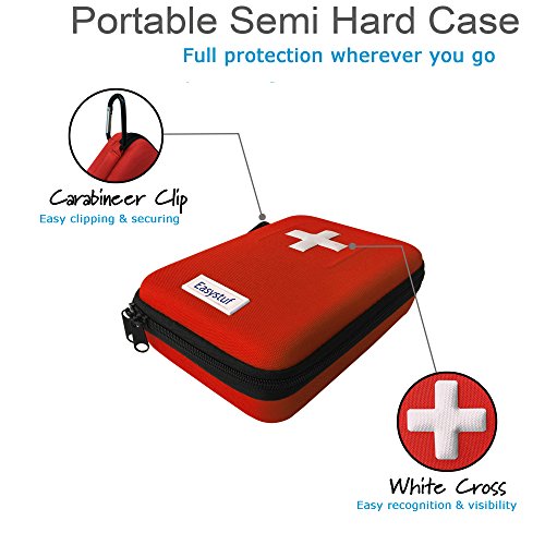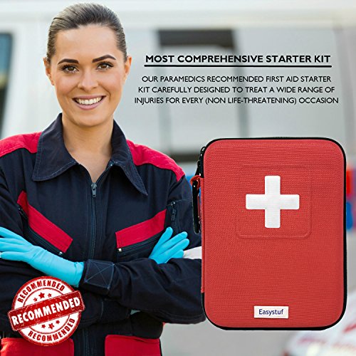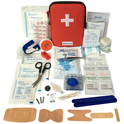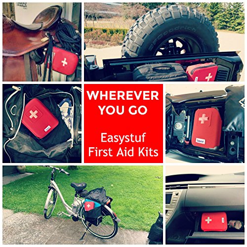 Studio : Easystuf Publisher : Easystuf Binding : Health and Beauty Product Description Easystuf's 100-Piece Mini-First Aid Kit Means Never Being Unprepared Again A first aid kit should contain more than just a bunch of sticking plasters, which is why ours contains almost 100 items, comprising over 30 different products. In fact, we believe it's the most comprehensive first aid kit you'll find for the price. Included in the bright red semi-hard case, which bears a large white cross so it won't easily get lost, are: * metal tweezers * lancets * scissors * a tourniquet * a CPR mask * an emergency blanket * a whistle * finger splints * safety pins * a cold pack * cleansing wipes * sterile pads and bandages in assorted sizes * and a short First Aid Tips booklet. There are too many items to list here, so please check the Ingredients section, below, for the complete contents of our kit. Compact Our first aid kit measures a mere 7.5" x 5.9" x 2.1", so it's small enough to keep anywhere. Or, if it's easier, you can clip it to your backpack, or belt, using the included carabiner. Well Organized Everything is visible in clear pockets, so you can quickly find what you need, and there's additional space to keep a few extra items. How Many Will You Need? You'll need at least one in the home - perhaps one in the kitchen and one in each bathroom, but our multi-buy promotions (see the Special Offers Product Promotions section above) mean you can also get some for your poolside, grill area, for each car, or to take on vacations, camping trips, days out, etc. Risk-Free Don't forget we offer a 100% manufacturer's satisfaction guarantee! Get Your 100-Piece First Aid Kit Today And Enjoy The Peace Of Mind That Comes From Being Prepared For An Emergency 0