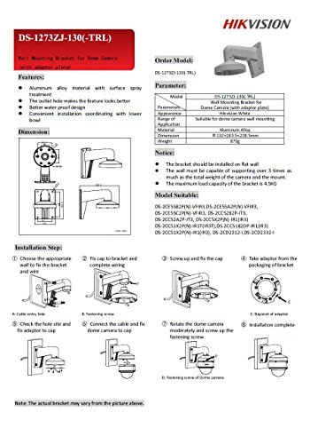 -. Feature : DS-1273ZJ-130-TRL PC130T Wall Mounted Bracket / Vandalproof Wall Bracket / Metal - Aluminum Alloy / Compatible with the following cameras: DS-2CD2342WD-I, DS-2CD2332-I, DS-2CD2312-I, DS-2CD2322WD-I, CMIP3042, CMIP1142, CMIP3022, NV723MF-IR, NV724MF-IR, DS-2CE56D5T-VFIT3, DS-2CE56D1T-VFIR3,DS-2CE56C2T-VFIR3, DS-2CE56D1T-IR3Z, DS-2CE56D5T-IR3Z