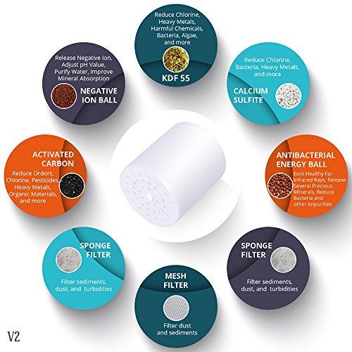 - SGS-Tested KDF 55 & 8-STAGE FILTRATION (H001v2) -- Proprietary blend of KDF 55, Calcium Sulfite (CaSO3), Activated Carbon, Negative Ion Balls, and Antibacterial Energy Balls -- works in both hot and cold water. All filter materials have passed rigorous safety and quality tests.