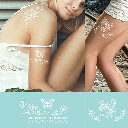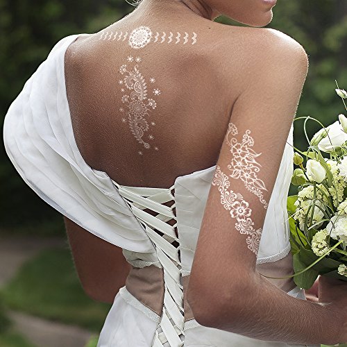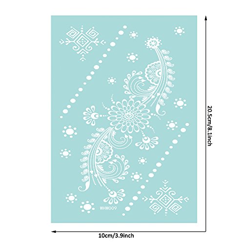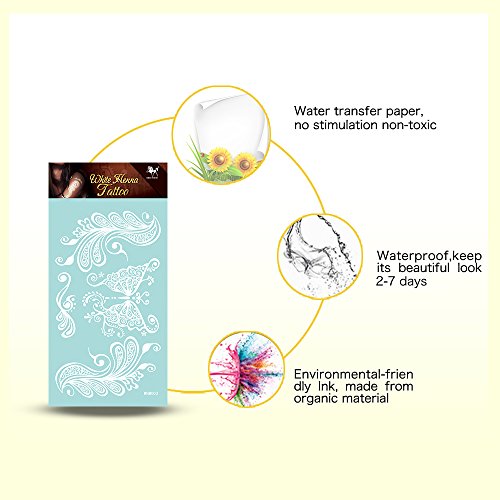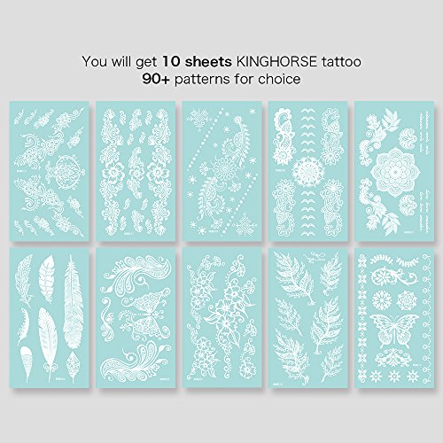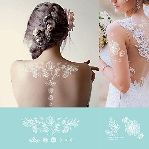 KINGHORSE white lace Temporary Tattoo can stick on your arms, shoulders and any other part of your body, and also it can cover scar on body. There are lovely, fashion, cool, sex, hot, elegant and wild designs type for different occasion of wedding, bridal showers, sleepovers, music festivals, party, school, holiday, photograph, nightclub and beach,anywhere really! Benefit: You get a variety of cool temporary tattoos in this set