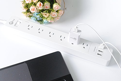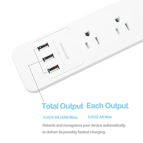 6 AC OUTLETS AND 3 USB CHARGING PORTS: This USB smart power strip allows you to power up to 9 electrical devices at a time. Fit for most household appliances and 5V digital products.2.4amps max each port or 4.8amps/24 Watt overall of the USB charger.Detects and recognizes your device automatically to deliver its possibly fastest charging.