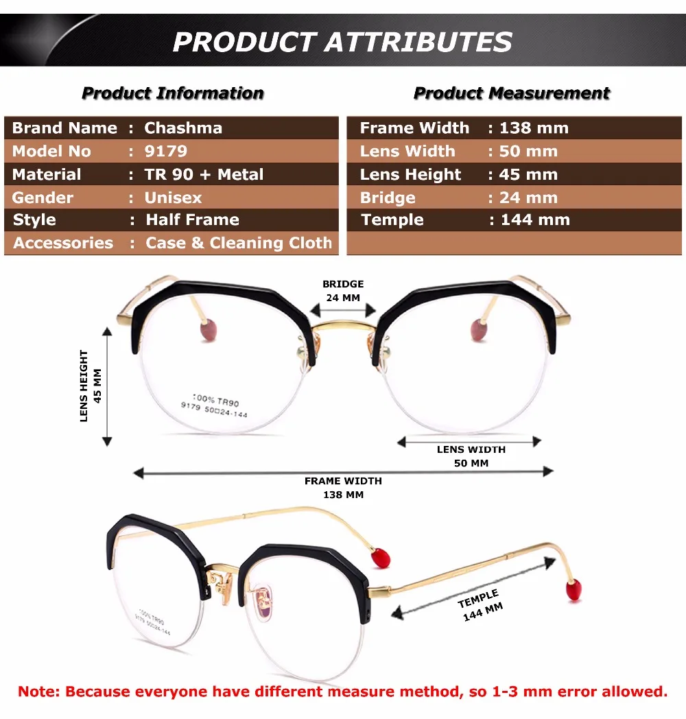 Frame Measurement:50-24-144 (lens width- bridge-temple)