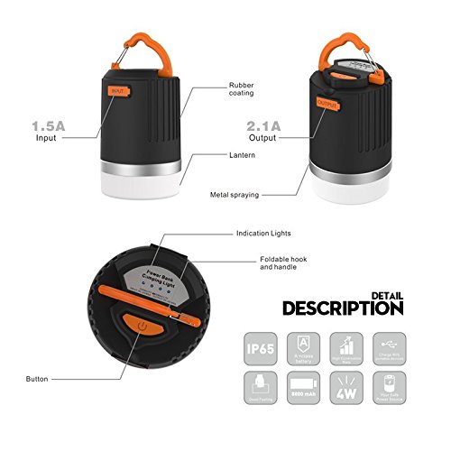 High Capacity Power bank, Powered by a 10400mAh Battery pack, Designed to keep your cellphone, Tablet, Camera powered, big capacity enables it charge an iphone 6 3 times,The lamp has a 5V 1.5A micro USB input port and a 5V 2.0A USB output port,the 5V 2.0A output makes it charging quickly enough.