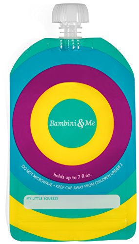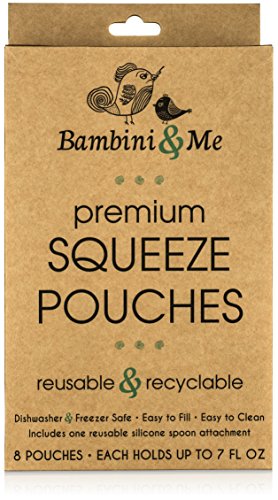 -. Title : Reusable Baby Food Pouch (8-Pack) — Refillable 6 oz. Toddler Squeeze Pouches w/Leak Proof Cap – Ideal for Homemade Puree, Drinks, Snacks, Yogurt, Pudding, BONUS Silicone Spoon -Bambini & ME