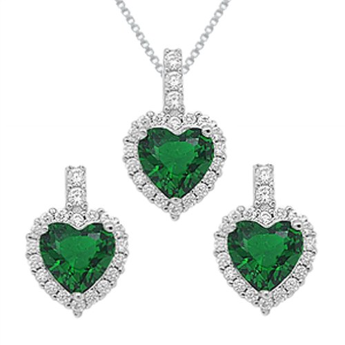 -. Title : Sterling Silver Simulated Emerald Heart Necklace and Earrings Set