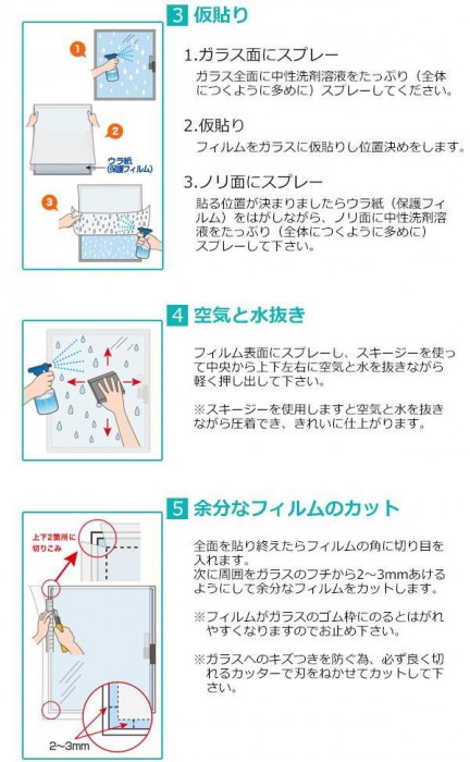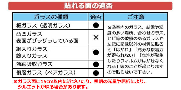 | 仕様 | 貼り方:水を使って貼るタイプ UV(紫外線)99%カット 飛散防止効果 耐熱温度:80度 |