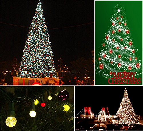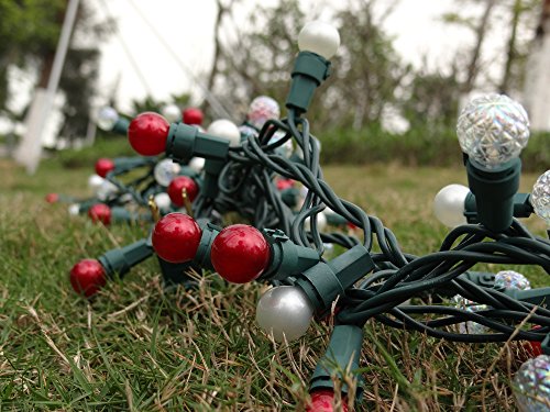 19 feet long string with 70 LED pearlized glass and iridescent diamond cut glass G15 bulbs, including 2 extra replace bulbs, end to end connectable. Light bulbs have candelabra (E12) socket base, UL listed