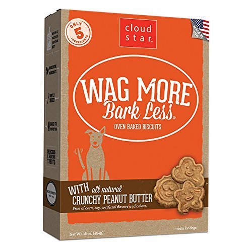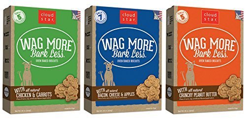 -. Title : Cloud Star Wag More Bark Oven Baked Dog Treats 3 Flavor Variety Bundle: (1) Wag More Bark Less Oven Baked Crunchy Peanut Butter, (1) Wag More Bark Less Oven Baked Bacon, Cheese, and Apples, and (1) Wag More Bark Less Oven Baked Chicken & Carrots, 16 Ounces Each (3 Boxes Total)