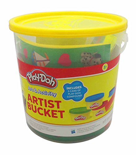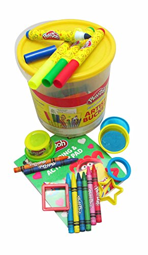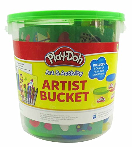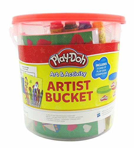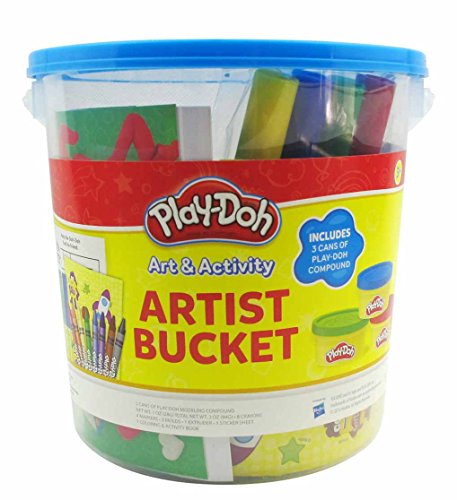 Play-doh large activity bucket with 3 tubs of 1 oz. Play-doh, 1 extruder, 3 molds, 8 crayons, 72 PG activity pad, sticker sheet, 10 popsicle sticks, 10 pipe cleaners (2 each of 5 colors), 8 googly eyes.