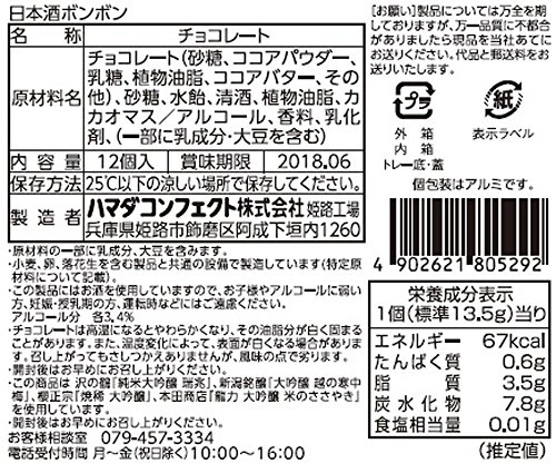 原材料:チョコレート(砂糖、ココアパウダー、乳糖、植物油脂、ココアバター、その他)、砂糖、水飴、清酒、植物油脂、カカオマス/アルコール、香料、乳化剤、(一部に乳成分・大豆を含む)