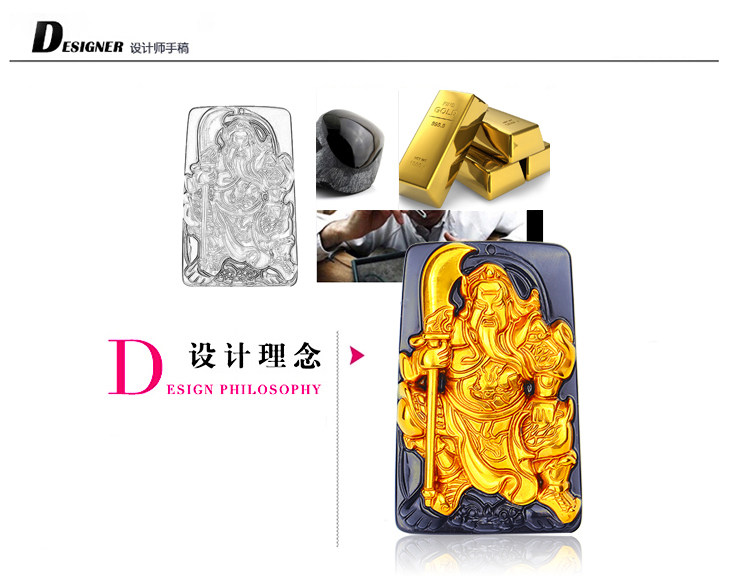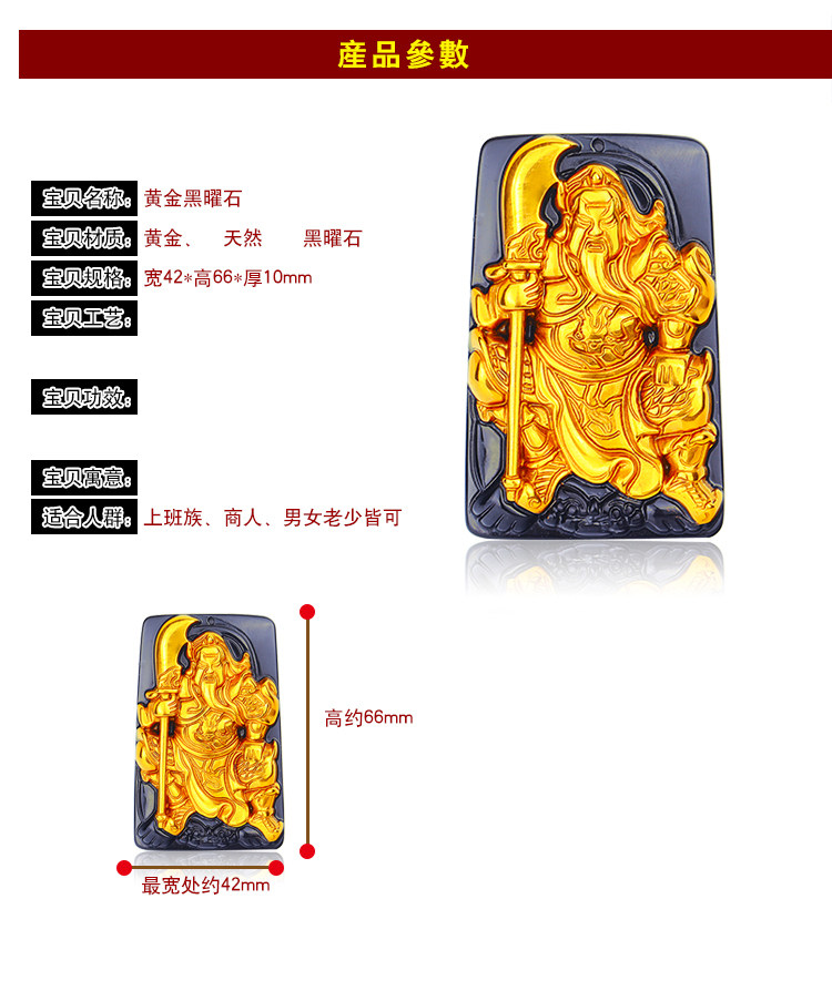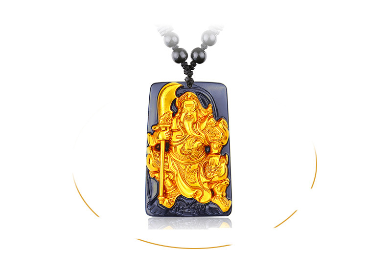 开光 黄金版黑曜石关公吊坠男士项链 武财神 霸气男士