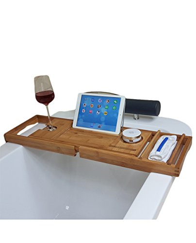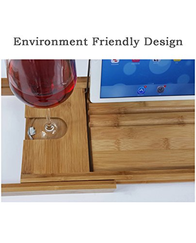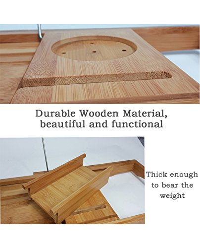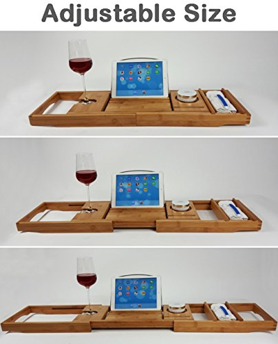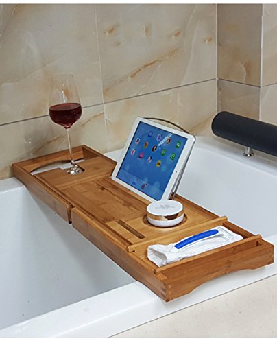 Features: - High Quality Bamboo Wood to provide a spa-quality look and feel, also it is durable and sustaninable construction - Adjustable Size, sturdy matching bamboo arms extend from each side of the caddy, accommodating tubs from 27 to 41 inches width, fits for most of tub - Bring your book and tablets into your bathroom, enjoy your bathing time. This stand can afford the standard-sized books or iPads, keeping them dry and close at hand - Want to have a drink when bathing? The left side of the caddy has a crevice where glasses can slide in to hold them sturdy and prevent tipping - Phone can be place on the tray so that you won't mss any message or phone call when you in the bathroom. There is also a moveable tray on the right side can fit your phone or any other bath essentials
