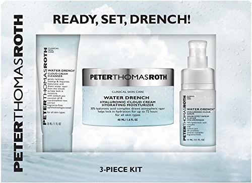 Studio : PETER THOMAS ROTH Publisher : PETER THOMAS ROTH Binding : Misc. Product Description ($102.00 Value) This trio duo is all you need. The non-stripping, fragrance-free cream cleanser gently removes makeup, excess oil and impurities while moisturizing skin with pure water vapor drawn from the clouds.??Hyaluronic Acid attracts and retains up to 1,000 times its weight in water from moisture in the atmosphere. The serum has an intense 75% Hyaluronic Acid Complex that helps replenish the appearance of aging and dehydrated skin with vital moisture.??The cloud cream moisturizer drenches skin with a liquid cloud of moisture drawn right from the atmosphere. The concentrated 30% Hyaluronic Acid cream transforms atmospheric vapor into fresh, pure water from the clouds, providing your skin with a continuous burst of intense hydration that lasts up to 72 hours! Kit Includes: WATER DRENCH HYALURONIC CLOUD CREAM HYDRATING MOISTURIZER?(48 ML / 1.6 FL OZ) WATER DRENCH HYALURONIC CLOUD SERUM?(15 ML / 0.5 FL OZ) WATER DRENCH CLOUD CREAM CLEANSER?(30 ML / 1.0 FL OZ) Directions: WATER DRENCH HYALURONIC CLOUD CREAM HYDRATING MOISTURIZER For best results, apply twice daily to face and neck and with continued use. For external use only. WATER DRENCH HYALURONIC CLOUD SERUM Apply as needed to face and neck for intense hydration. WATER DRENCH CLOUD CREAM CLEANSER Dispense a small amount into palms of hands. Add water and rub hands together. Massage onto face, focusing on areas with makeup. Rinse thoroughly with water. Use once or twice daily, or as often as needed. For external use only. Net Weight: Please see individual item. Ingredients: Water Drench Hyaluronic Cloud Cream Hydrating Moisturizer: Water/Aqua/Eau, Glycerin, Dipropylene Glycol, Dimethicone, Cyclopentasiloxane, Cyclohexasiloxane, Yeast Extract, Sodium Hyaluronate, Ceramide Eop, Ceramide Eos, Ceramide Ap, Ceramide Np, Ceramide Ns, Sambucus Nigra Fruit Extract, Hydrolyzed Silk, Sodium Pca, Tocopherol, Ascorbyl Palmitate, Caprooyl Phytosphingosine, Caprooyl Sphingosine, ... 0