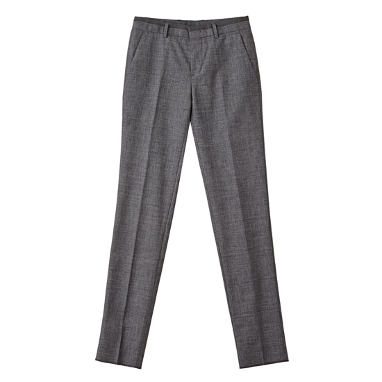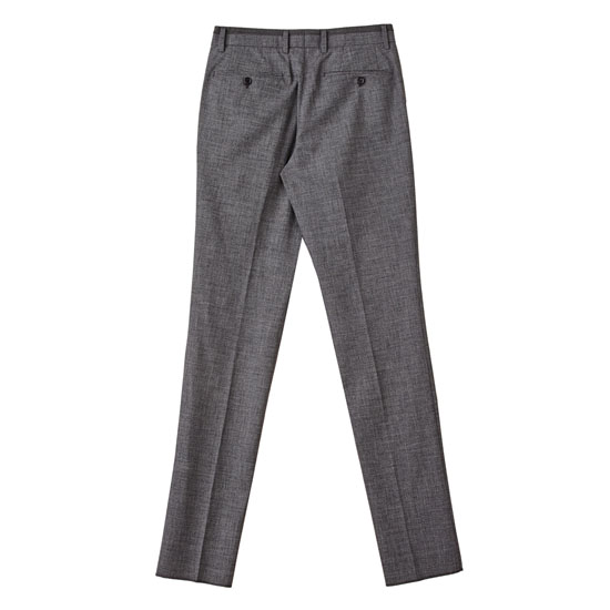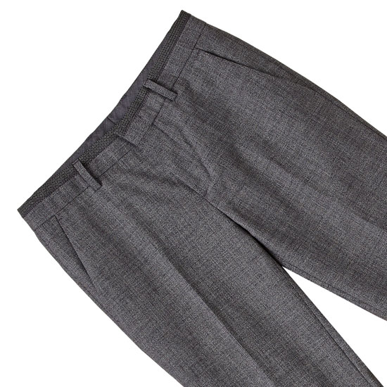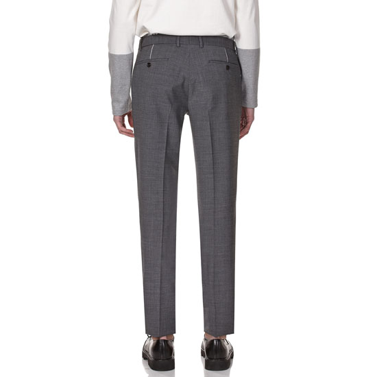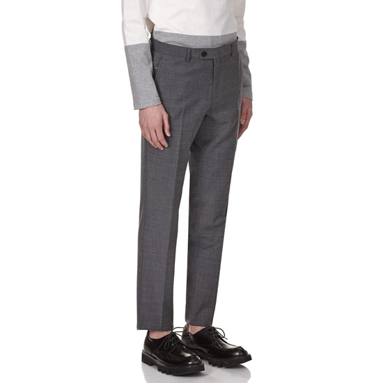 - 멜란지 그레이와 블랙 하운드투스 패턴이 돋보이는 남성 팬츠.