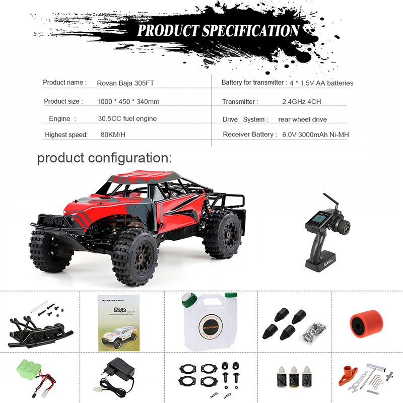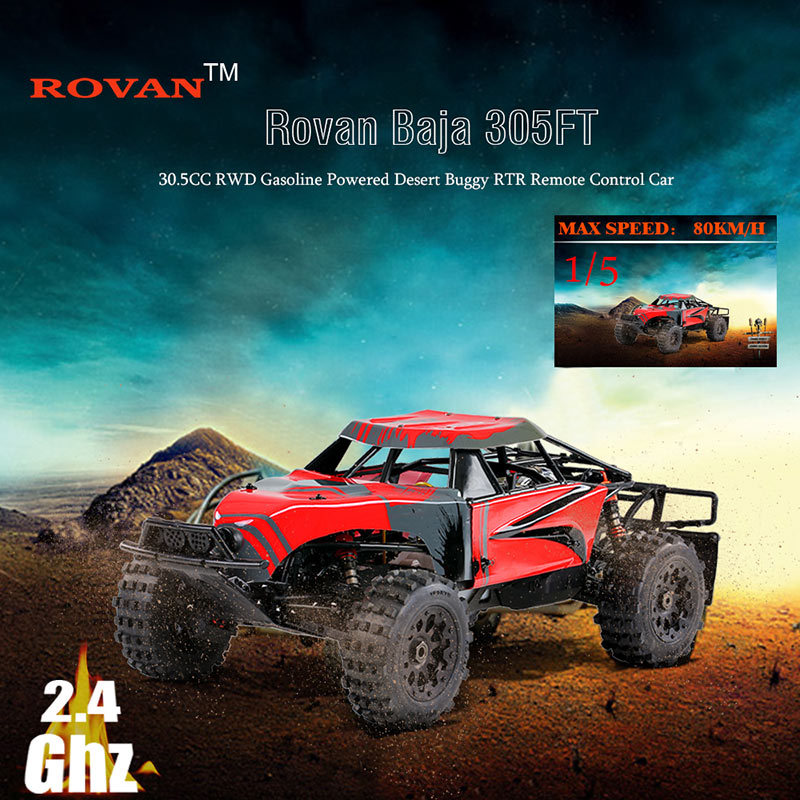 This Rovan Baja 305FT is a super gasoline powered desert buggy RC car. The off-road car has all the features you are looking for, perfect design with protective roll cage,wonderful workmanship and good quality will never fail to attract the RC vehicles lovers.The extra large scale RC vehicles will bring more excitement and challenge. It is now available completely ready to run. Just fuel up and go enjoying the fun!