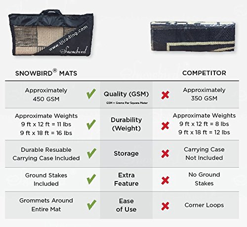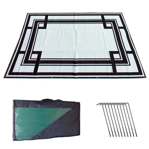 Studio : T.J. Trading, Inc. Publisher : T.J. Trading, Inc. Binding : Misc. Product Description Hollow polypropylene tubes are woven together to form an attractive and durable mat. Cleaning is easy with just some water or a few sweeps from a broom. Mildew is never a problem because the woven construction allows the water to drain. Each mat is light and can be folded into a very compact size for easy storage. Does not harm the grass. For long life, put away after each use. Great for R.V.s, outdoor events, camping, beach, and dog runs. Grommets throughout the mat, not just the corners. Comes with free ground stakes and reusable carrying case. 0