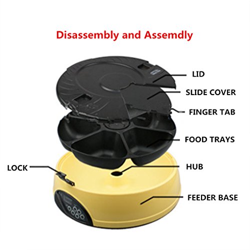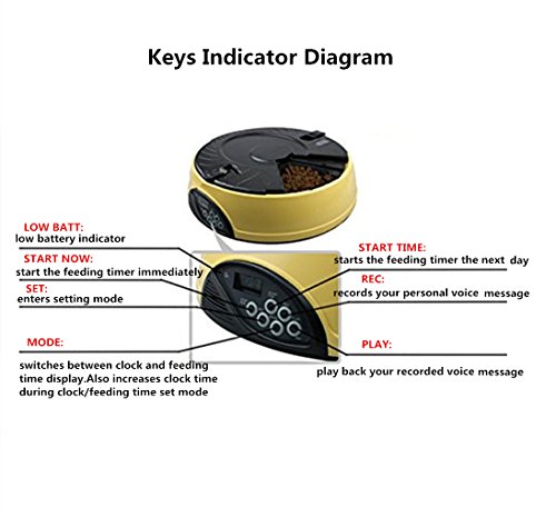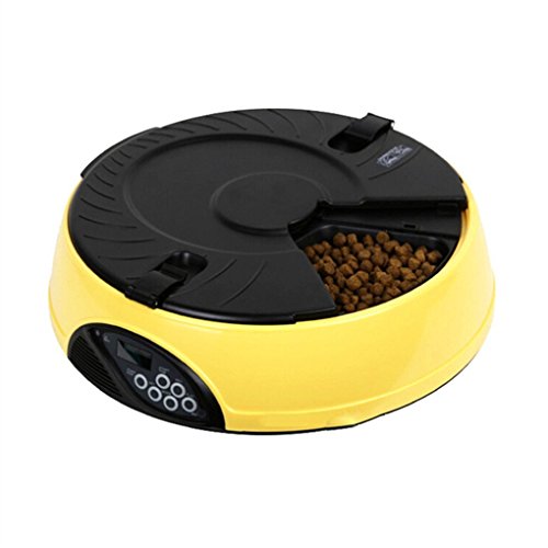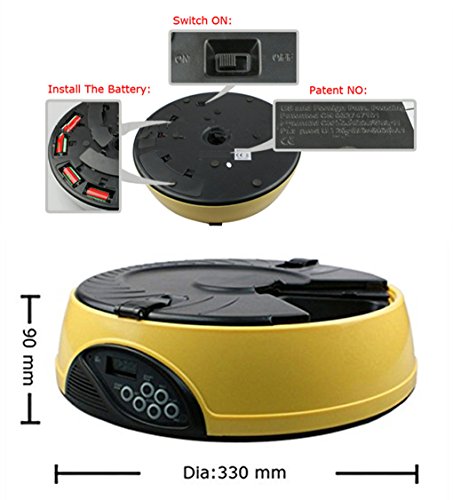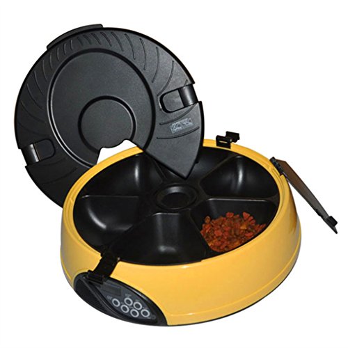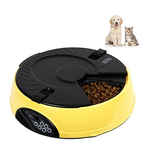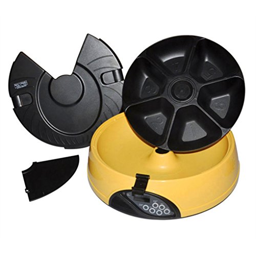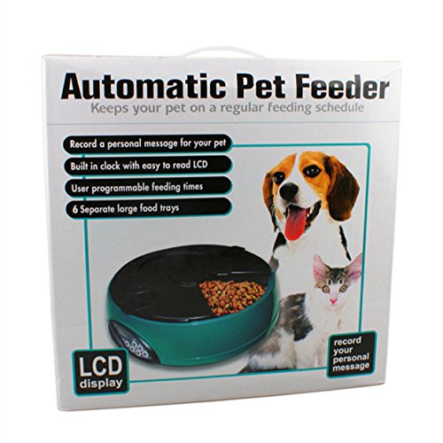 Studio : YOOSKE Publisher : YOOSKE Binding : Misc. Product Description 1.This 6 Meal Programmable Feeder to help feed your dog or cat while you are out of town or while you were on vacation. This unit was easy to set up and works well to dispense your dogs or cats food. 2.The cover was not so easily breakable. 3.This item simply did work when you try programming it by following the instructions and it will work. It would rotate to the first feeding setting and advance to the next timed settings. 4.Every time you eat, the feeder can play a length of up to 8 seconds of personalized recording, to remind you of the love of the meal friends. 5.Moreover, unlike a large easy feeder, it only opens one cell at a time. This automatic feeder is an excellent tool, regardless of the owner at home also go out, can keep the dog good eating habits.