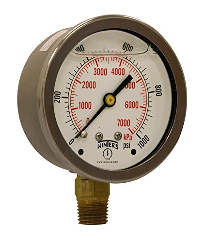 Winters PFQ Series Stainless Steel 304 Single Scale Liquid Filled Pressure Gauge with Brass Internals, 0-1000 psi, 2-1/2" Dial Display, +/-1.5% Accuracy, 1/4" NPT Bottom Mount