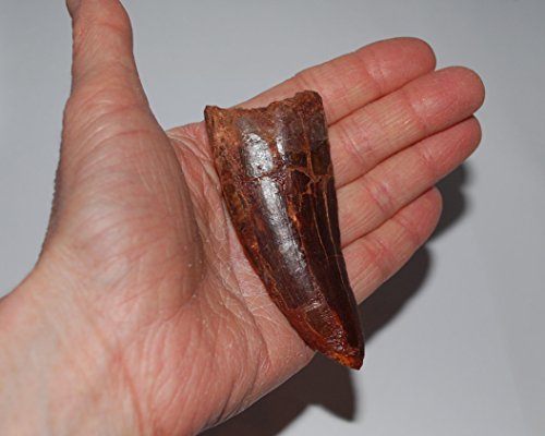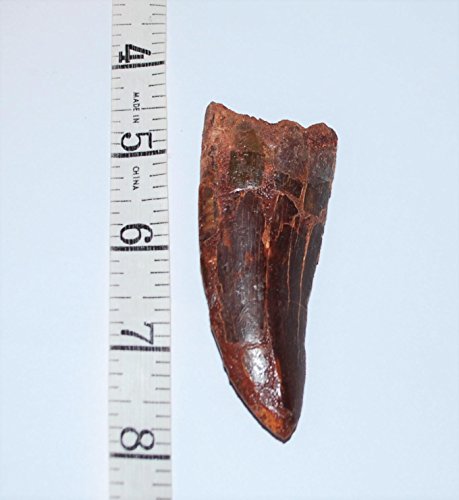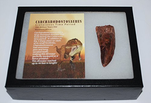 Studio : Fossils, Meteorites, More Publisher : Fossils, Meteorites, More Binding : Toy Product Description This is a tooth from Carcharodontosaurus, otherwise known as "African T-Rex". I guarantee this is a genuine dinosaur tooth. It measures approximately 2.91 inches in length. Included with the fossil is a glass topped display box and nice color information card. This is a great gift idea for a fossil lover! Carcharodontosaurus was from the Cretaceous period, about 100 million years ago! This tooth was found S. of Taouz, in the Moroccan Sahara. Possibly larger than T-Rex, this dinosaur had large serrated "steak-knife" teeth superbly adapted to cutting and rending flesh. Coupled with strong muscular neck and rear legs, this dinosaur was a fearsome predator. We have a variety of other Carcharodontosaurus teeth in various sizes and qualities so be sure to check out our other items! 0