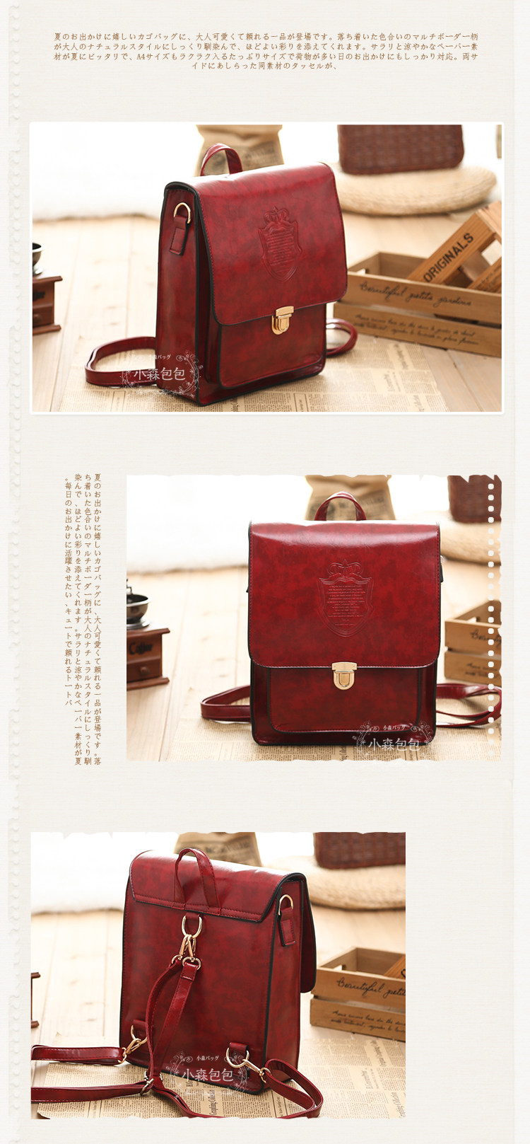 型号 森 066面料 PU皮重量 0.7KG内衬 PU皮配件 两根肩带 可调节款式 双肩 单肩 手提尺寸 底长26CM 高29CM 厚9CM肩带总长120CM 可调节容量 可放普通三折雨伞 IPAD 手机 纸巾 化妆小物 长款钱包 放A4会顶到拉链 结构 一个拉链壁袋 一个挖袋