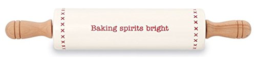 - Ceramic rolling pin features debossed Baking spirits bright sentiment, cross-stitched detail and wooden handles.