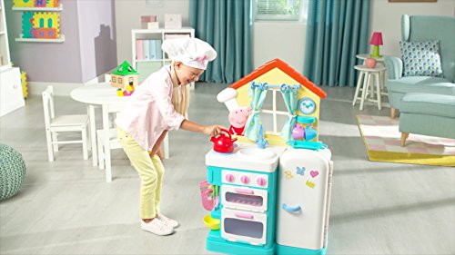 Cook up a storm with Peppa! Peppa Pig’s Giggle ‘n’ Bake Kitchen stands 37 inches tall – the perfect height for little chefs! This fun kitchen set-up includes all the sights and sounds of Peppa’s kitchen, including a teakettle that whistles, a frying pan that sizzles, and a faucet that makes water sounds! There’s a light in the oven so you can keep an eye on your cupcakes, then open the oven door and use your oven mitt to take them out and frost them! With a total of 18 play accessories, there’s a feast of fun to be had when you’re in the kitchen with Peppa!Feature